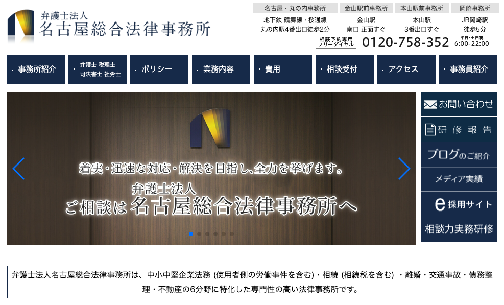 名古屋総合リーガルグループ![]() | ★★ | ★★ 相談無料だが 着手金あり | ★★ | 愛知県内に 4拠点 |